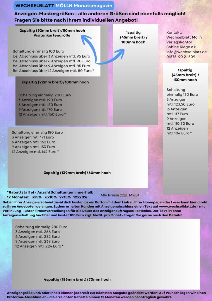 - Alle Preise gelten für gelieferte Anzeigenvorlagen. Durch uns erstellte Anzeigen dürfen nicht an andere Medien weitergeleitet werden, jedoch nach Rücksprache mit dem Verlagskontor Sabine Riege e.K. für eigene Social-Media-Kampagnen genutzt werden